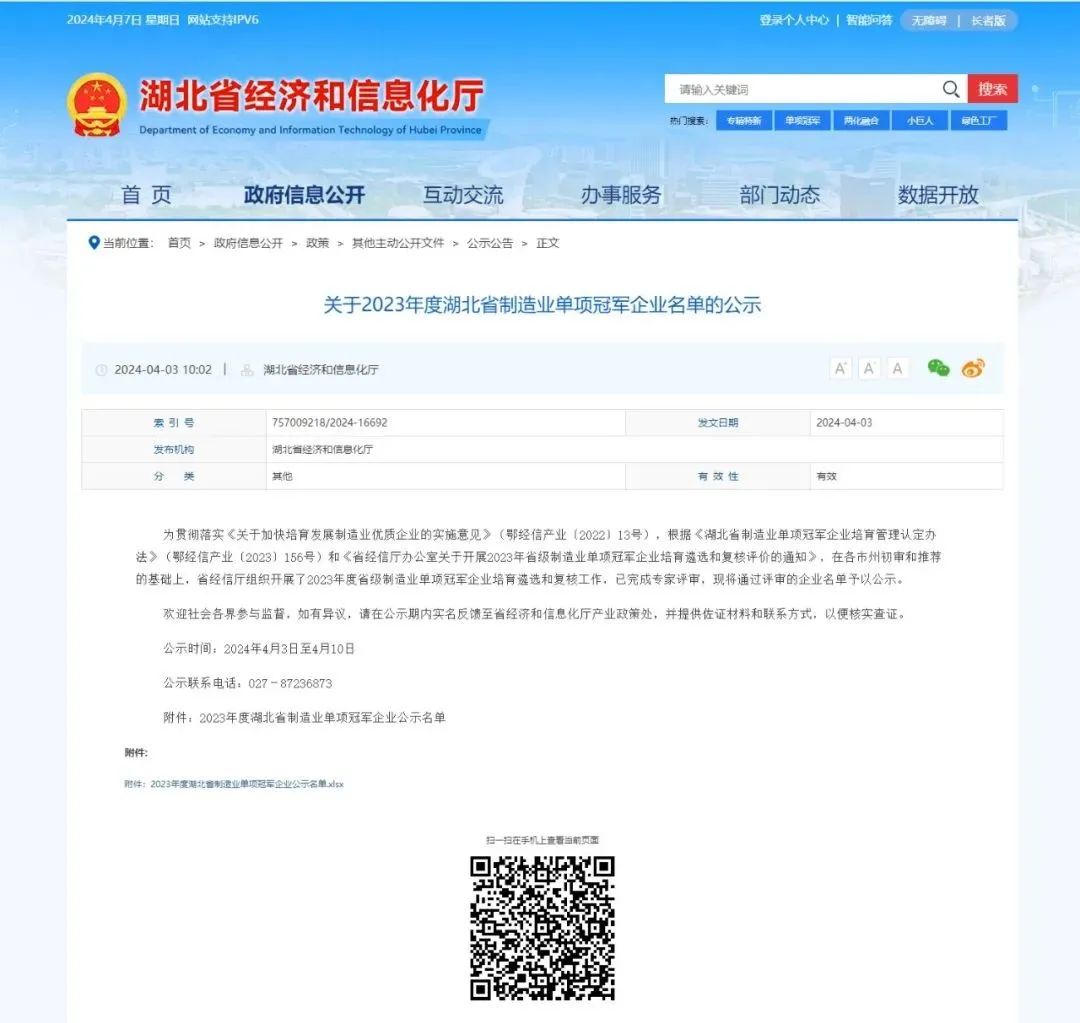 近日,湖北省經(jīng)濟和信息化廳公示了“2023年度湖北省制造業(yè)單項冠軍企業(yè)”名單。