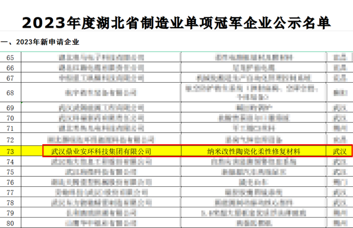 武漢鼎業(yè)安環(huán)科技集團有限公司(序號73)通過遴選和復核,以“納米改性陶瓷化柔性修復材料”產品,入選2023年度“湖北省省級制造業(yè)單項冠軍企業(yè)”名單。