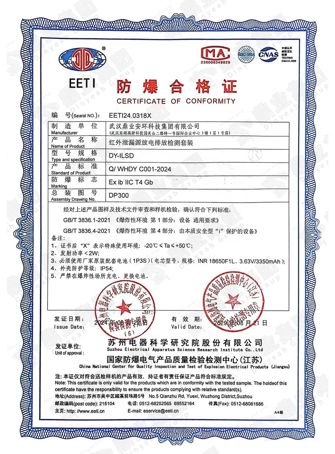 近日,由武漢鼎業(yè)安環(huán)科技集團(tuán)有限公司自主研發(fā)的“紅外泄漏源放電排放檢測(cè)套裝”,經(jīng)過(guò)國(guó)家防爆電氣產(chǎn)品質(zhì)量檢驗(yàn)檢測(cè)中心審查,確定設(shè)備符合防爆標(biāo)準(zhǔn)的要求,具有極高的安全性和可靠性,可用于各種易燃易爆場(chǎng)所安全工作,現(xiàn)已順利取得防爆合格證。