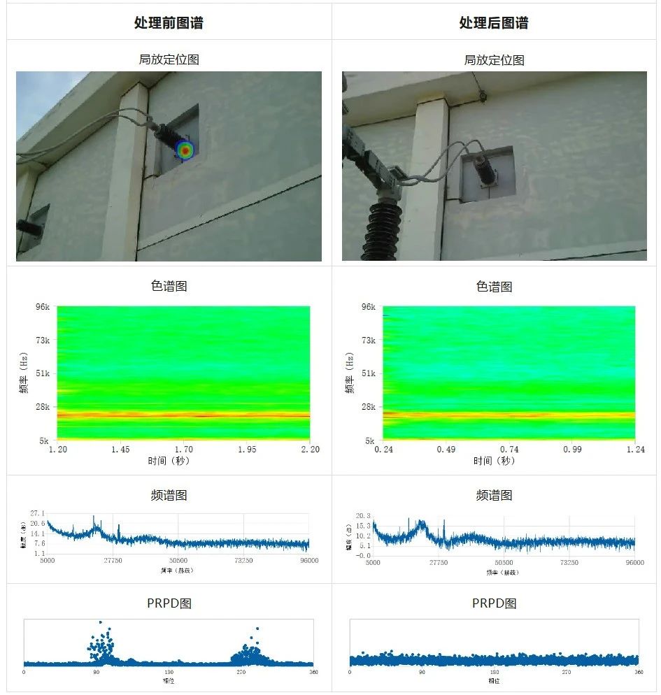 處理前:室外穿墻套管在20kHz~50kHz頻段范圍內(nèi)出現(xiàn)局部放電定位光斑,色譜圖和頻譜圖上25kHz能量值為17dB,PRPD圖出現(xiàn)明顯相位聚焦效應(yīng),判斷為沿面放電或內(nèi)部放電。