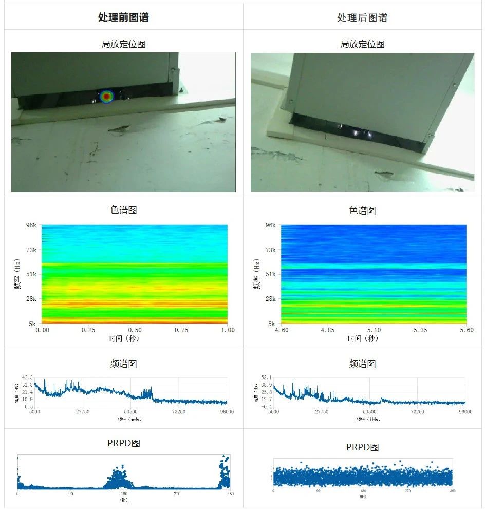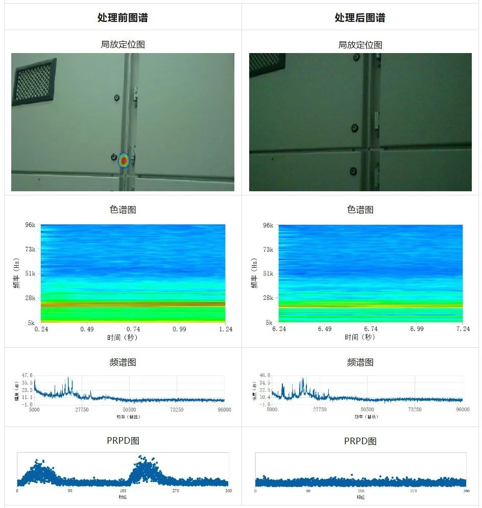 處理后:對發(fā)現(xiàn)局放的室內(nèi)穿墻套管進行清理維護,超聲成像沒有出現(xiàn)聚焦光斑,超聲波定位頻段的聲音能量和現(xiàn)場環(huán)境噪聲能量值一致,超聲信號的PRPD圖相位聚焦現(xiàn)象消失,局部放電問題得以消除。
