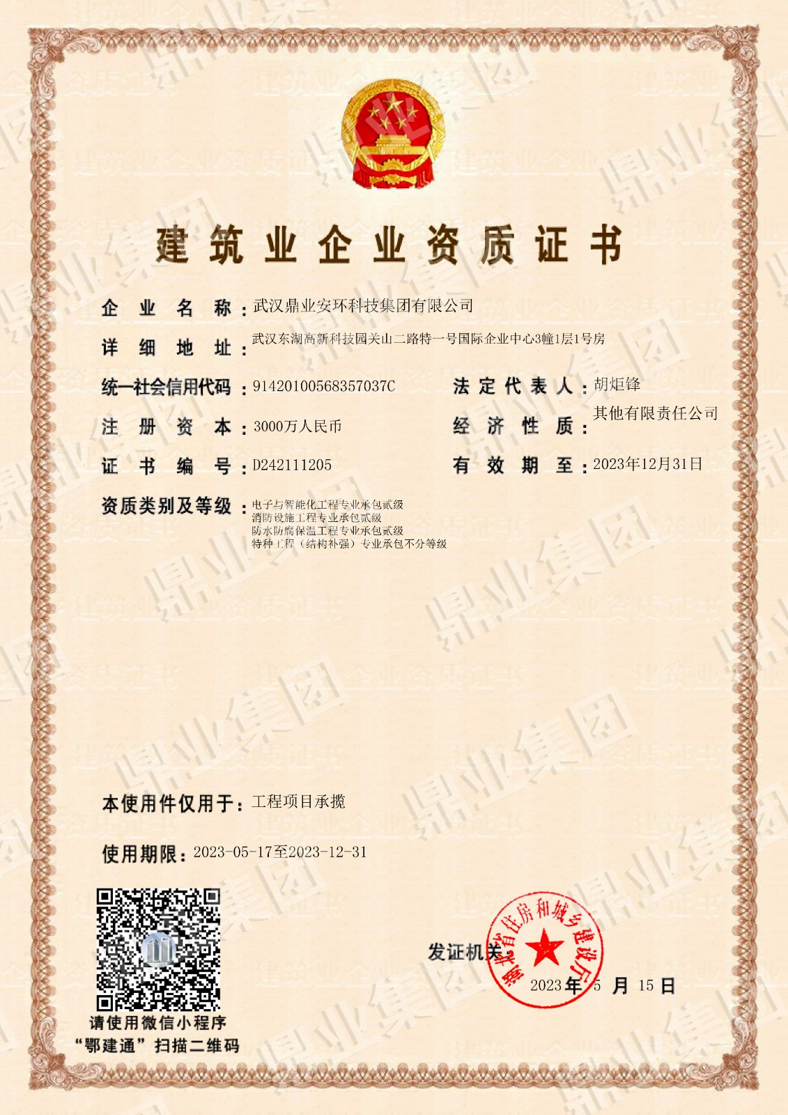 鼎業(yè)安環(huán)集團連續(xù)6年被評為武漢市瞪羚企業(yè)、高新技術(shù)企業(yè),榮獲國家專精特新“小巨人“、“湖北金種子”、“湖北省制造業(yè)單項冠軍稱號”,武漢首批“雄鷹企業(yè)”,集團擁有158份專利和軟件著作權(quán)”。擁有環(huán)保工程專業(yè)承包二級證,安全生產(chǎn)許可證(二級資質(zhì)工程項目承攬、施工勞務(wù)工程項目承攬),建筑業(yè)企業(yè)資質(zhì)證,特種設(shè)備生產(chǎn)(壓力容器改造)許可證,防爆產(chǎn)品合格證。通過質(zhì)量、環(huán)境、職業(yè)健康、安全管理體系(“QEOJ”管理體系)認證,安全生產(chǎn)標準化達標企業(yè)三級認證,檢驗檢測機構(gòu)資質(zhì)認證,知識產(chǎn)權(quán)管理體系認證,誠信管理體系認證,售后服務(wù)認證,社會責任管理體系認證,固廢、危廢、回收加工處理企業(yè)服務(wù)能力等級資質(zhì)認證。